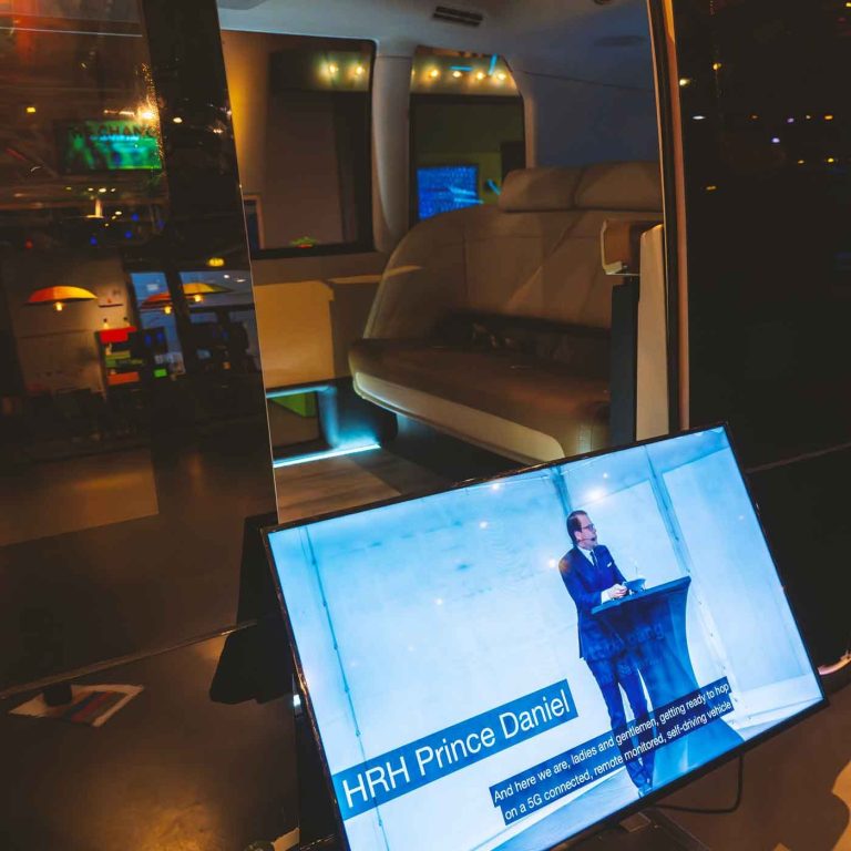 Här är en självkörande buss som tagits fram av T-Engineering i huset bredvid. Är det så här vi kommer att åka i städerna i framtiden? Hoppa in och sätt dig och känn hur det känns.
